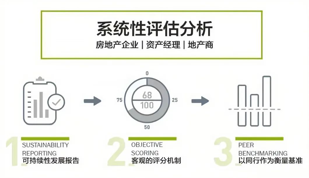定性分析指標 :可持續性風險評估、績效改善項目、項目涉眾參與度等。以地產基準為例,GRESB的評估方面有三個:
