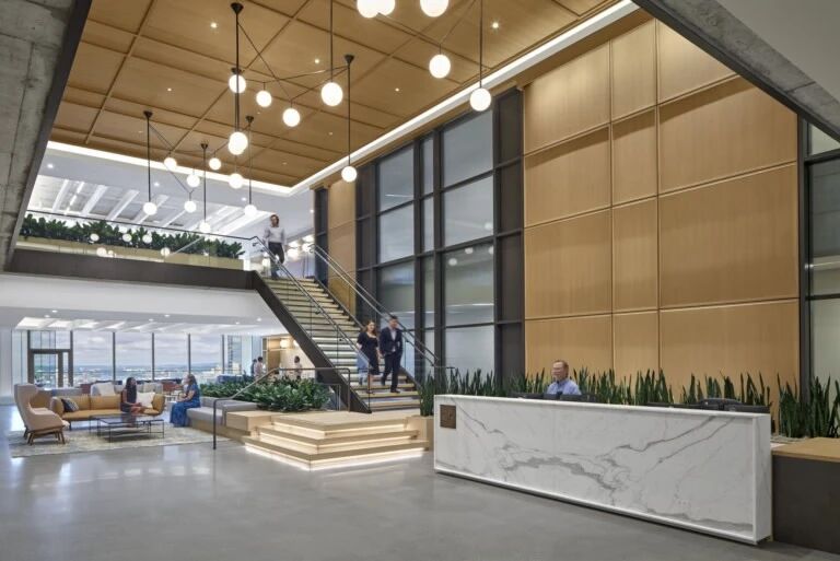 結(jié)合功能分區(qū):核心筒周邊常設(shè)置公共空間(如接待區(qū)、休息區(qū)、會議室等),形成高效的人流組織流線。例如,部分項目在核心筒附近設(shè)置開放式茶水吧,分割和連接各功能空間,增強空間節(jié)奏感。