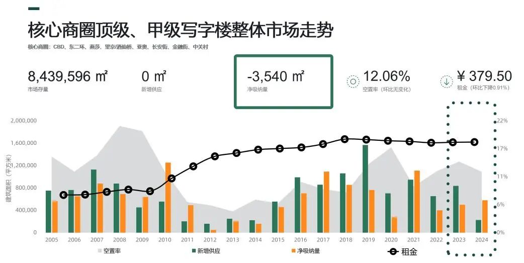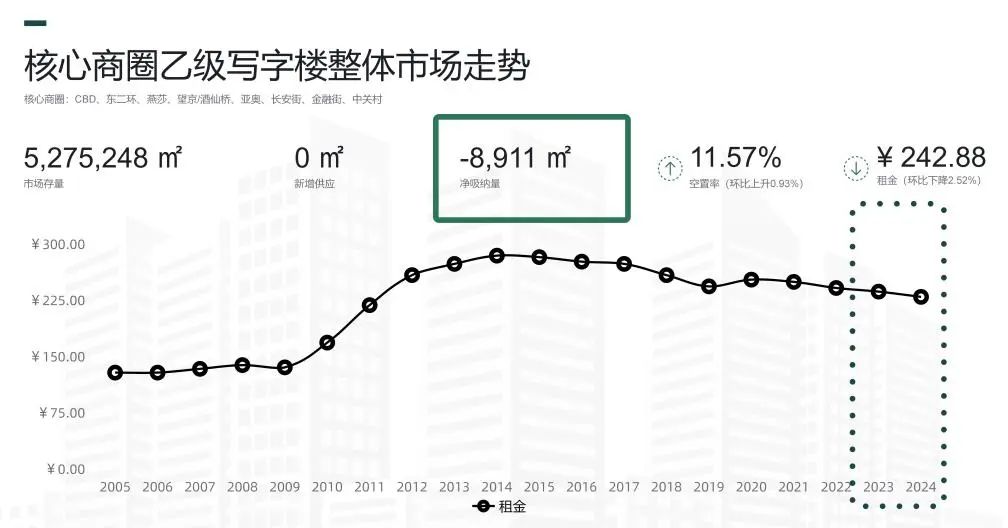 核心商圈整體乙級(jí)寫字樓凈吸納量為-8,911平方米。空置率受部分樓宇租戶退租影響,上升0.93個(gè)百分點(diǎn)至11.57%。租金呈現(xiàn)明顯的下降趨勢(shì),環(huán)比上季度降低2.52個(gè)百分點(diǎn)至每平方米每月242.88元。其中中關(guān)村、金融街商圈租金環(huán)比下降3.9和3.5個(gè)百分點(diǎn);望京/酒仙橋和亞奧商圈租金環(huán)比下降2.8個(gè)百分點(diǎn)。